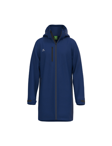Gefütterte Jacke mit 5.000 mm Wassersäule durch wasserabweisende Membran; Abnehmbare Kapuze mit Kordelzug; 2-Wege-Reißverschluss mit Kinnschutz aus Fleece an der Innenseite; Brusttasche mit Reißverschluss; Seitliche Reißverschlusstaschen; Innentasche; Große Mesh-Innentaschen; Eingearbeitetes Bündchen mit Daumenloch und Klettverschluss an den Ärmeln; ERIMA Logo auf der Brust